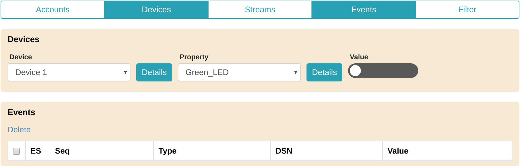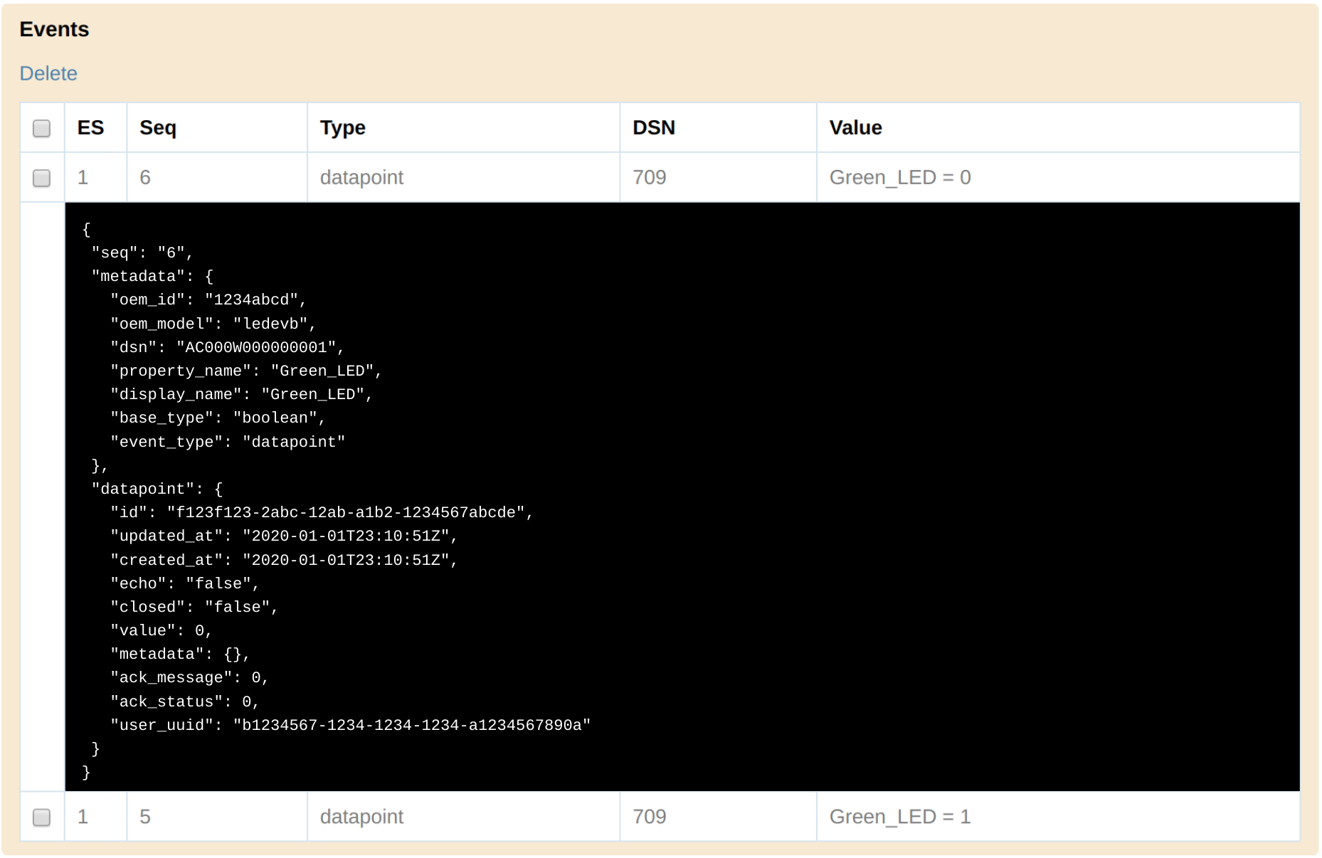 - Toggle the Green_LED property value several times to generate and receive several datapoint events: